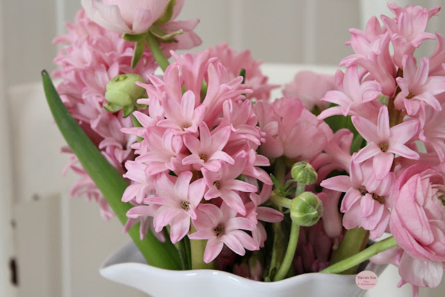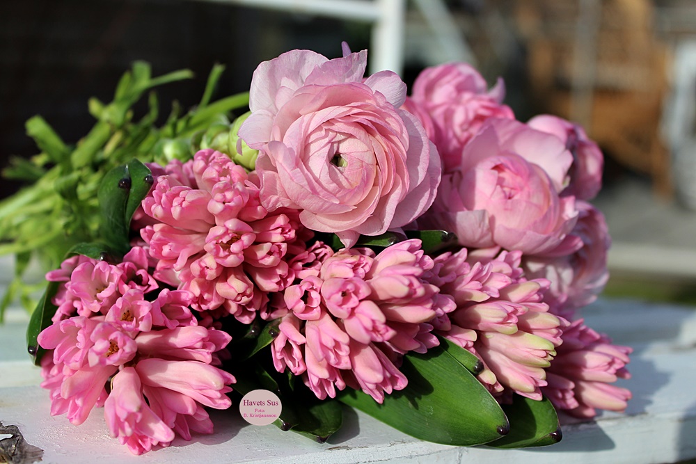 Her har jeg valgt at sætte ranunkler sammen med hyacinter.