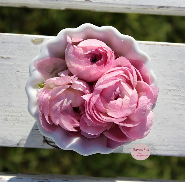 Der er mange muligheder. Der var nogle af ranunklerne der var knækket og i stedet for at smide dem ud, tager jeg altid en skål og fylder med vand og så pýnter de der.